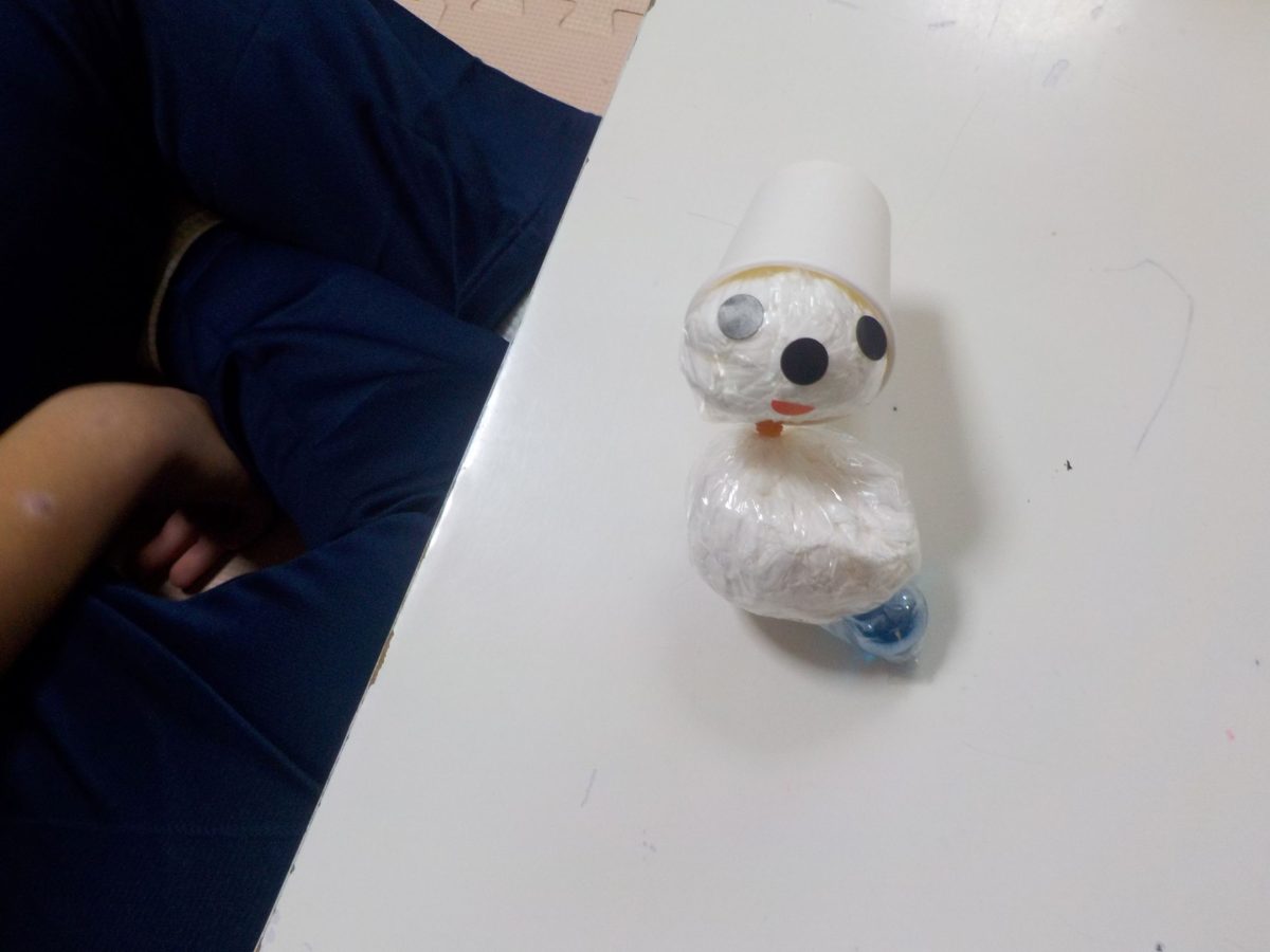 ビー玉を支えに使ったり、輪ゴムを使って雪だるまのくびれの部分を作ったり