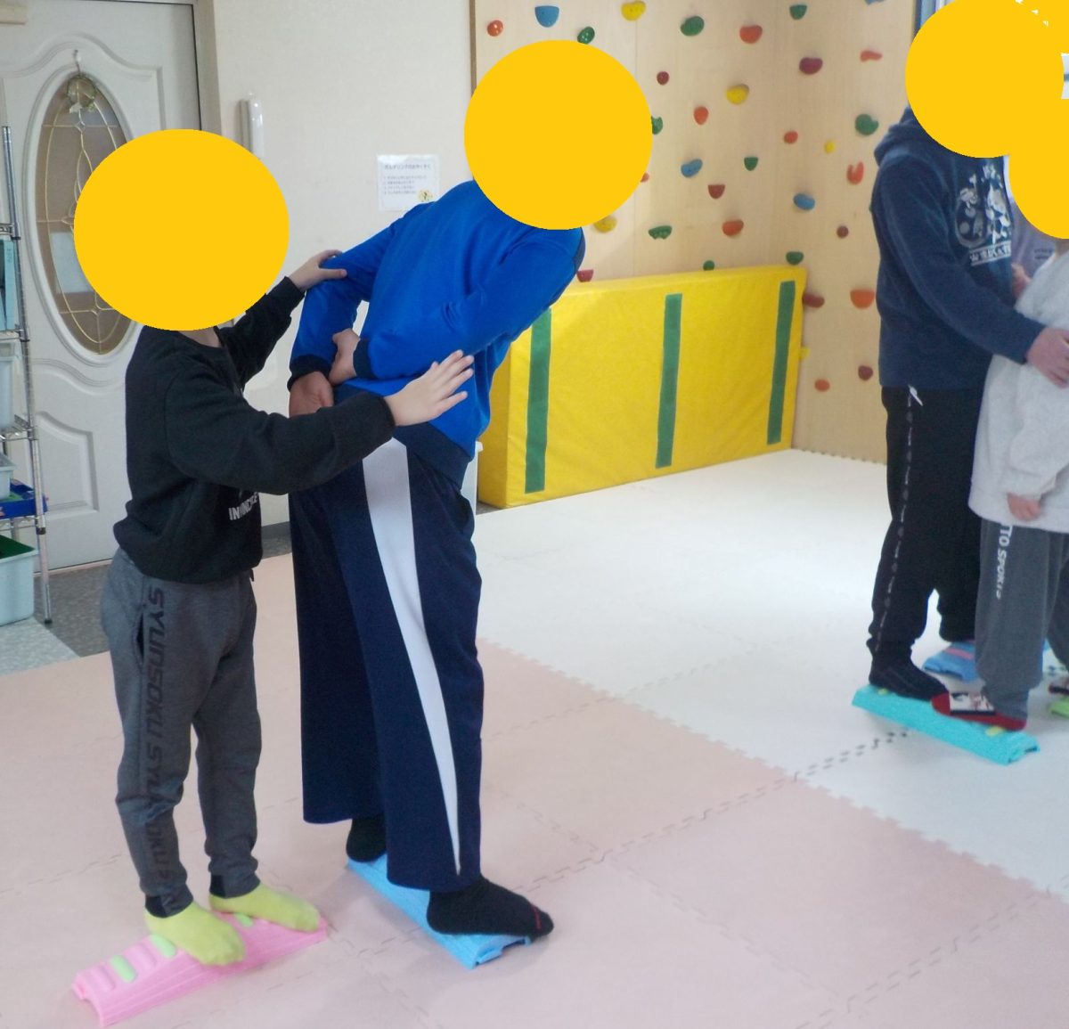 チーム内でバランスボードから落ちないように協力する